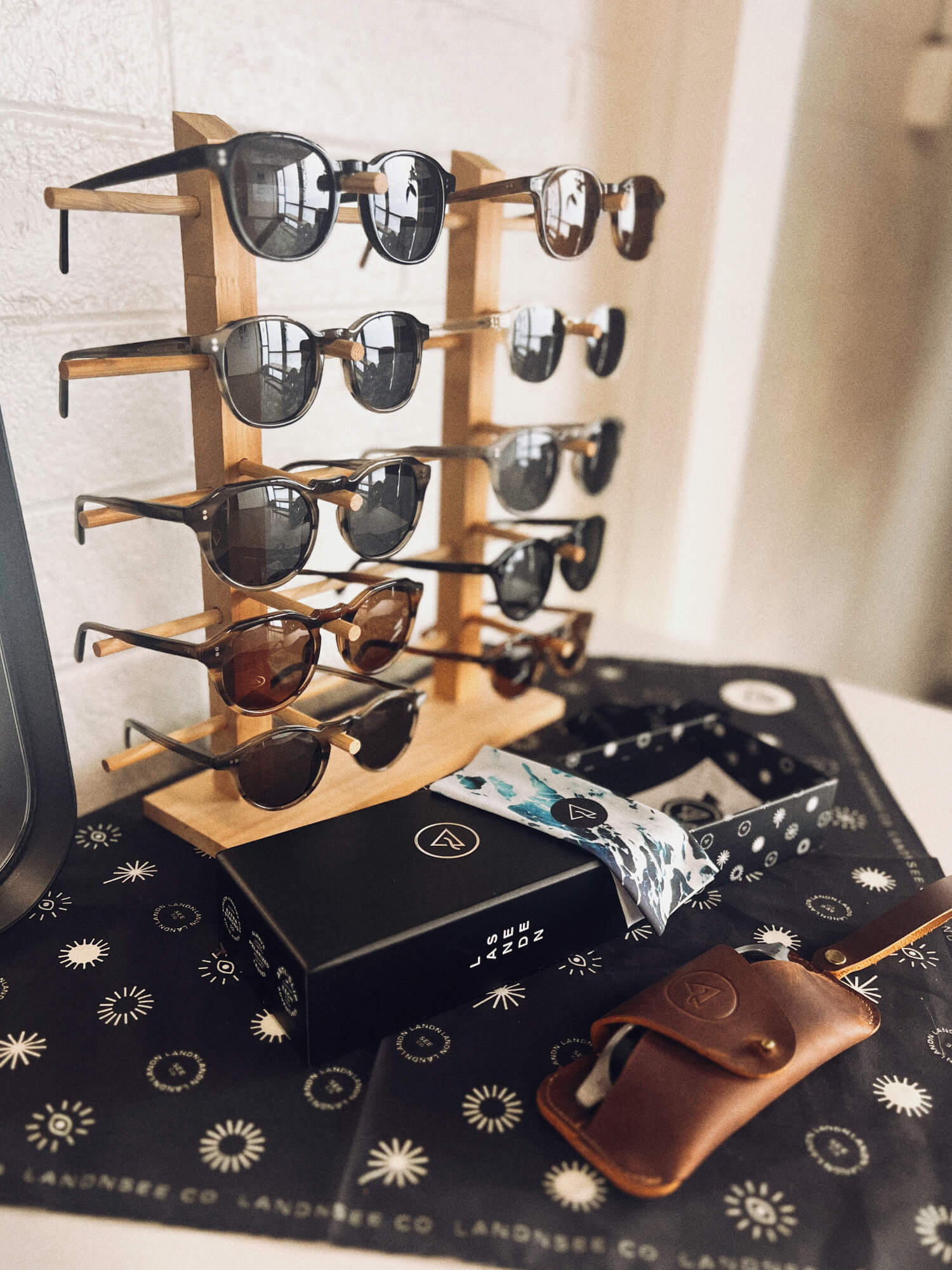 100% real leather with 'LANDN SEE' logo press. 18" length. Rubber ends for attaching to most size glasses.